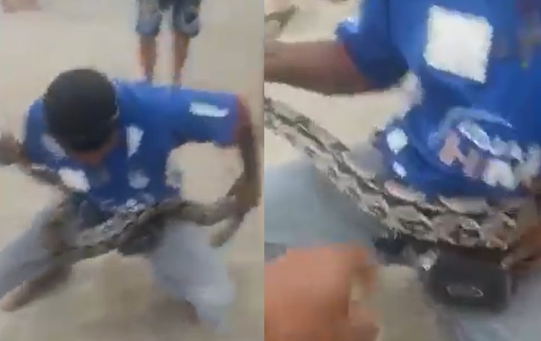 Conforme as imagens, o animal já está recuperado e um grupo de pessoas se diverte enquanto um homem brinca com a cobra tentando causar medo em todos. Algumas pessoas aproveitam para tocá-la.