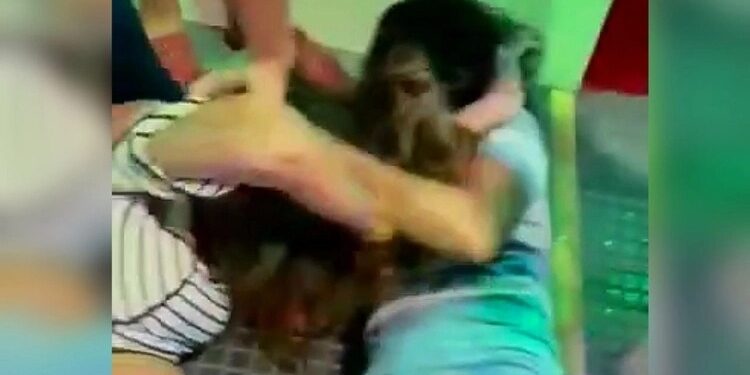 Nas imagens, várias pessoas tentaram apartar a briga, mas as mulheres rolam no chão agarradas uma no cabelo da outra.