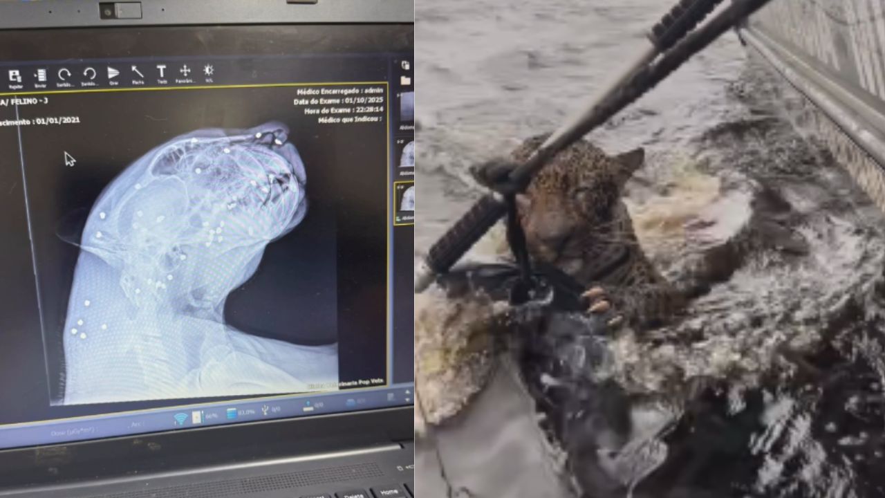MANAUS (AM) – A onça resgatada após passar horas nadando no Rio Negro, em Manaus, na quarta-feira (1º), foi submetida a exames veterinários que revelaram uma grave situação: o animal estava com cerca de 30 projéteis de chumbinho espalhados pelo corpo. Além disso, apresentava dentes quebrados e quadro de debilidade.