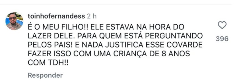 O suspeito foi identificado como Fabio Litaiff e ainda não se pronunciou sobre o caso. O menino de 8 anos sente dores fortes no ouvido devido à suposta agressão, causada porque Fabio ficou incomodado com barulho.