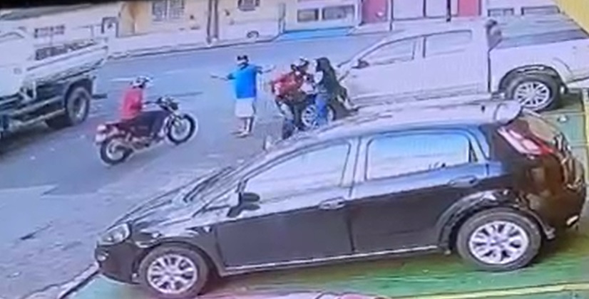 MANAUS – Uma dupla foi filmada assaltando pai e filha na terça-feira (23), no bairro Petrópolis, zona Sul de Manaus. Os dois abordam as vítimas e a menina ainda reluta em dar o celular, momento em que o criminoso enfia a mão no bolso dela.