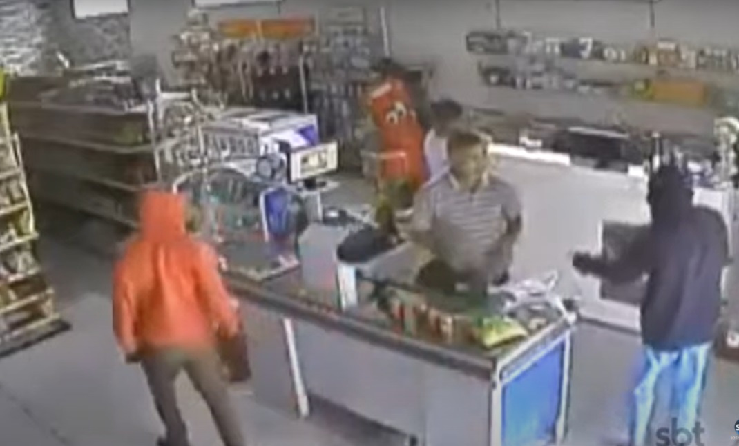 Nas imagens, é possível ver os assaltantes fazendo a abordagem e pegando o dinheiro do caixa. Ao tentar impedir, Eloir Castanho Ortiz, de 52 anos, é atingido por dois disparos. Lucas Ortiz, de 19, tenta socorrê-lo e é baleado. Veja;