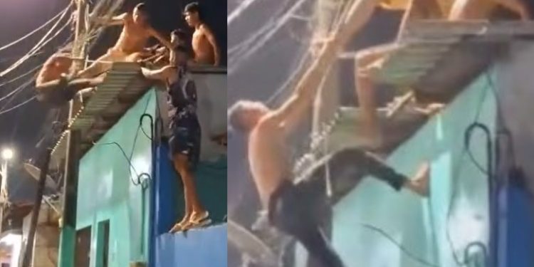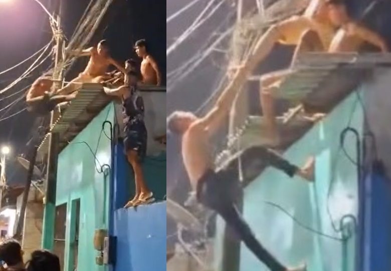 O homem ainda tentou se segurar nos fios, mas era cachorro amarrado e a peia comento. A sorte dele foi que a polícia chegou após a surra, antes que ele fosse morto.