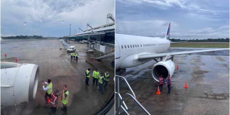 O voo da LATAM tinha como destino Brasília; em vídeos gravados por passageiros, a equipe de manutenção e o comandante aparecem conferindo a turbina após o ocorrido.