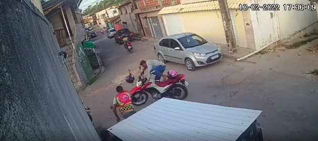 O homem estava numa motocicleta e nas imagens é possível ver que um mototaxista chega ao local e percebe que o ladrão está se aproximando de moto. Ele tira o capacete e conversa na esquina com outros colegas.