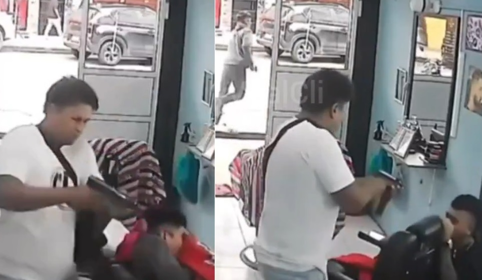 Os clientes fugiram enquanto o barbeiro tentou se proteger com a cadeira. O caso aconteceu no Equador. Após entender que a arma não iria disparar, o matador correu também.