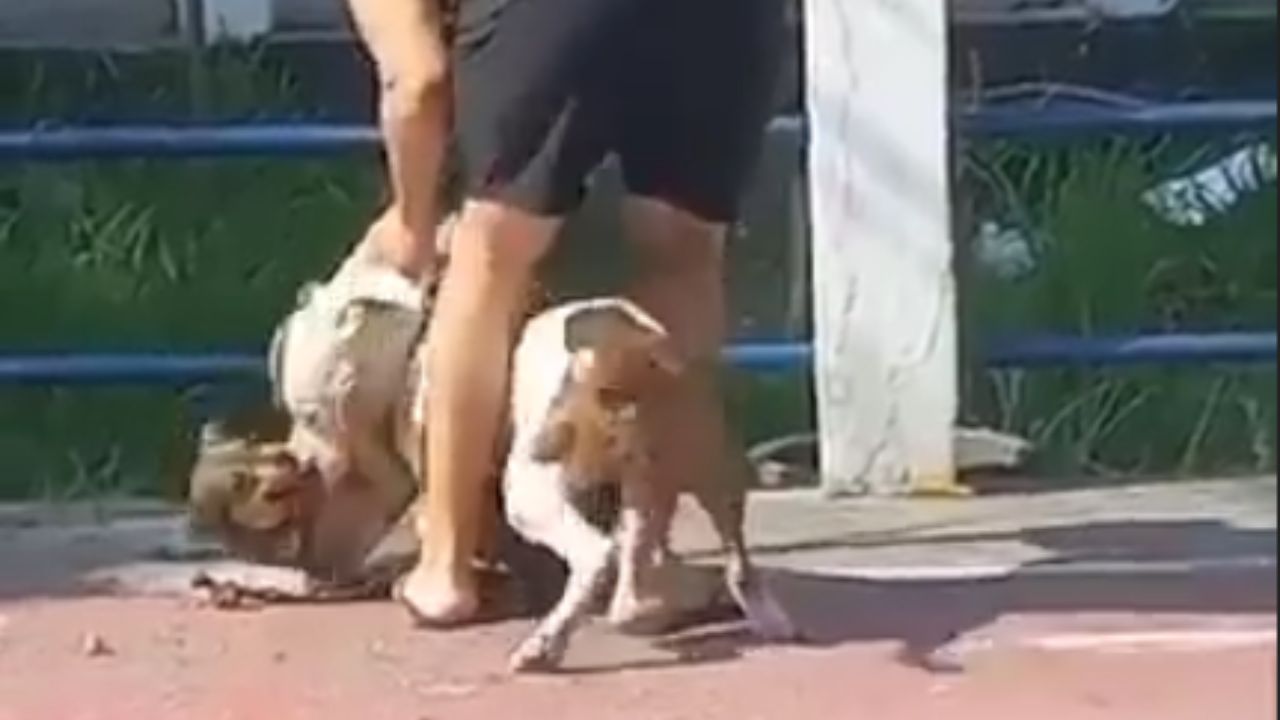 Nas imagens o dono aparece tentando separar os dois com um pedaço de madeira, enquanto o cão pequeno agoniza e chora.