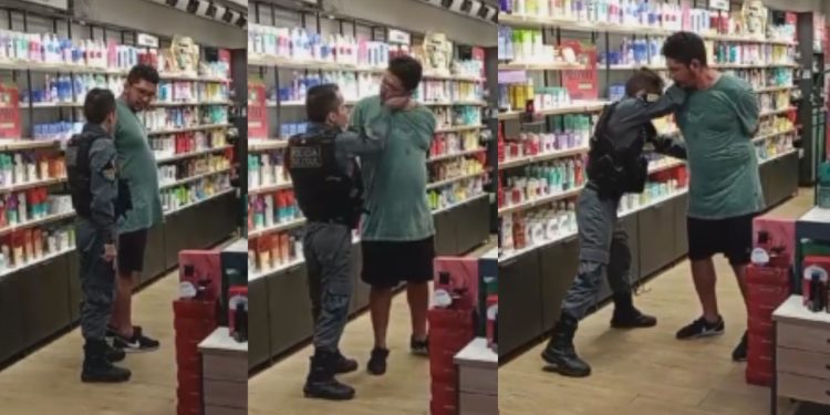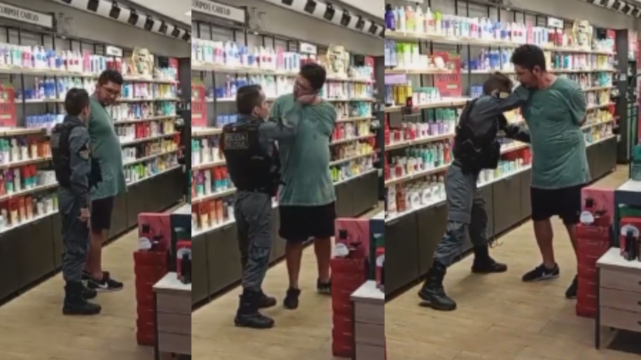Testemunhas dizem que o homem que aparece nas imagens, detido por dois PMs, foi pego após roubar um creme da loja O’Boticário. Os agentes então levam o suposto ladrão até a loja para confirmar o fato, quando há um desentendimento entre eles.