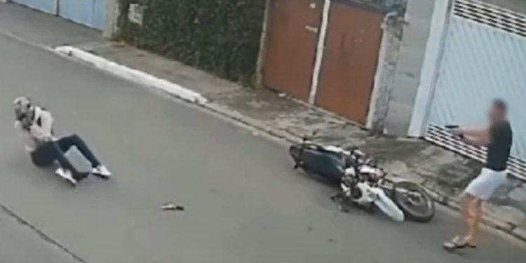 BRASIL – Um PM de folga cancelou o CPF de um assaltante no fim de semana, com 10 tiros. A imagem da reação contra o suspeito foi registrada por câmera em Barrania, bairro Jabaquara, em São Paulo.