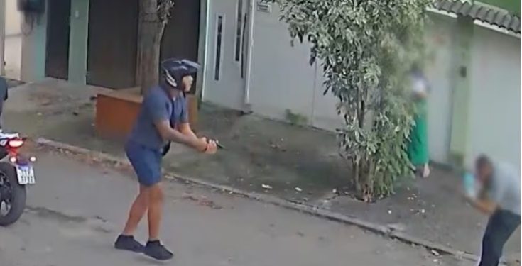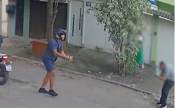 O policial estava com a esposa e o filho de 8 meses no colo dela, quando os bandidos chegaram de moto. O PM aparece de joelhos, ferido, e os bandidos fugindo.