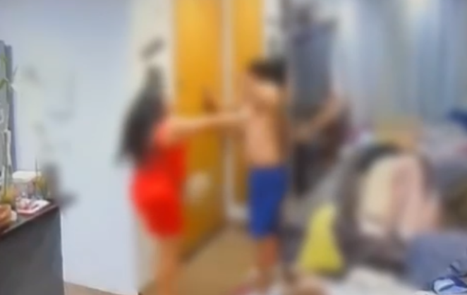 Logo em seguida o agressor aparece já desferindo socos e chutes. Ele empurra a amiga e depois a expulsa da residência, ficando sozinha com a vítima que cai no chão, bate a cabeça e desmaia. Ele continua batendo nela com uma cadeira e a arrasta pelos cabelos.