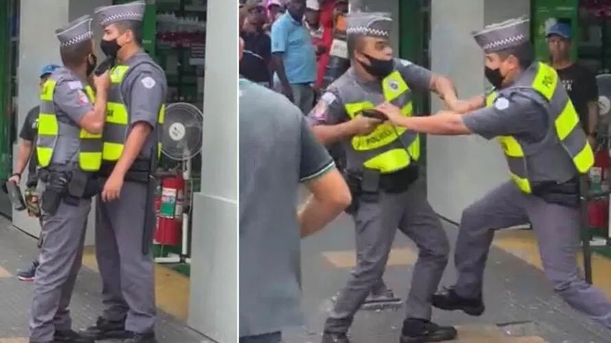 No vídeo, que foi gravado por pedestres, é possível ver o momento em que um dos policiais encara e aponta a arma para o colega, que reage com um empurrão. Eles ainda trocaram mais golpes antes de serem contidos, segundo testemunhas.