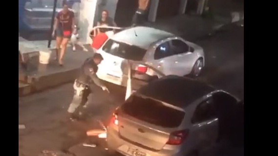 Um policial flagrou o exato momento em que o suspeito se preparava para abordar um motorista de aplicativo e conseguiu impedir a ação criminosa. Ele deteve o assaltante e o agrediu com vários chutes, no meio da rua. A cena foi registrada por moradores, que assistiram todo o flagrante.