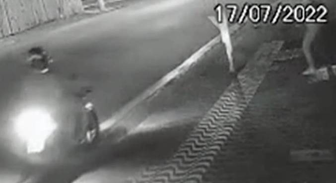 Conforme as imagens, os suspeitos se aproximam de moto e a policial atira. O piloto é atingido duas vezes, bate numa árvore e cai. O outro, no entanto, consegue fugir.