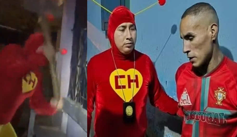 MUNDO – Um policial peruano viralizou ao se fantasiar de Chapolin durante operação que prendeu um traficante na quinta-feira (17/). Ele chegou até a usar uma marreta para arrombar a porta.