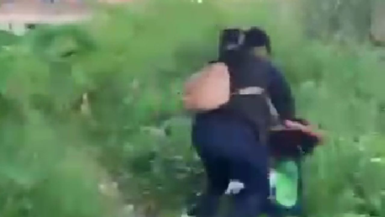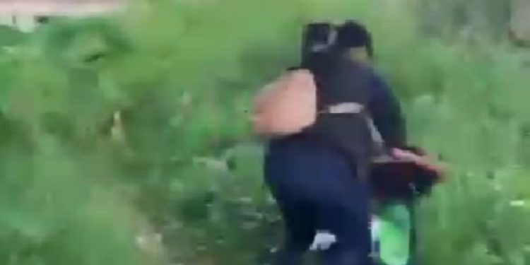 No vídeo, uma estudante aparece pegando uma jovem pelos cabelos até uma área de mata. Em seguida, ela joga a outra aluna no chão e começa a dar socos.