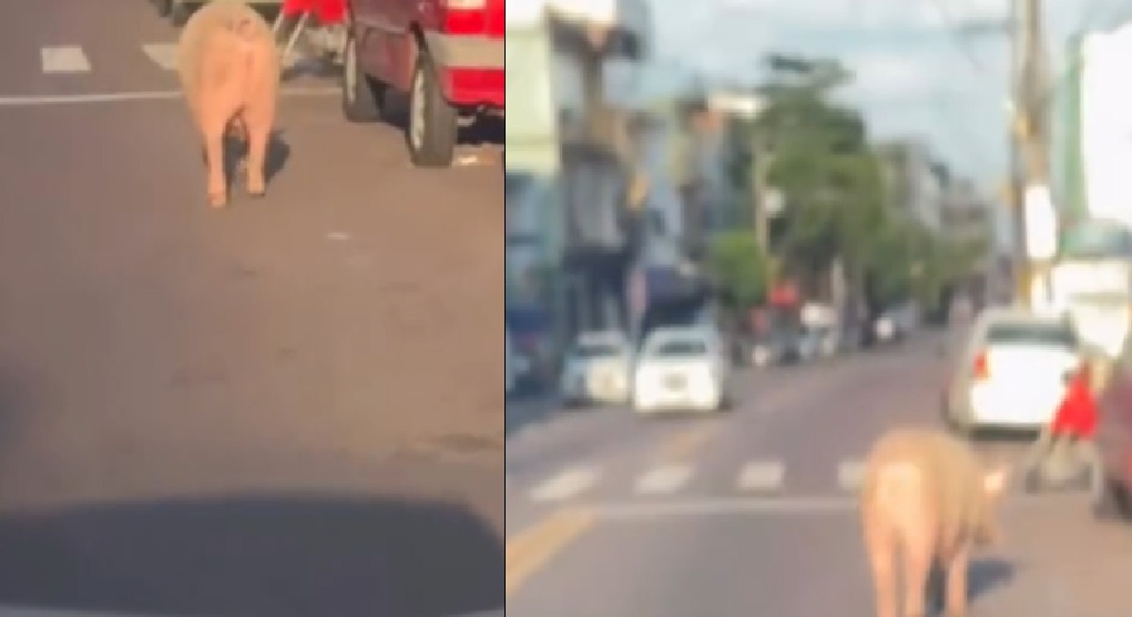 Os moradores da região não fazem a menor ideia de onde o porco surgiu e quem seria o dono do animal, que seguiu vagando pela rua entre carros e pessoas.