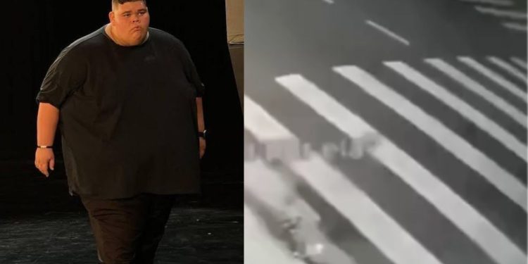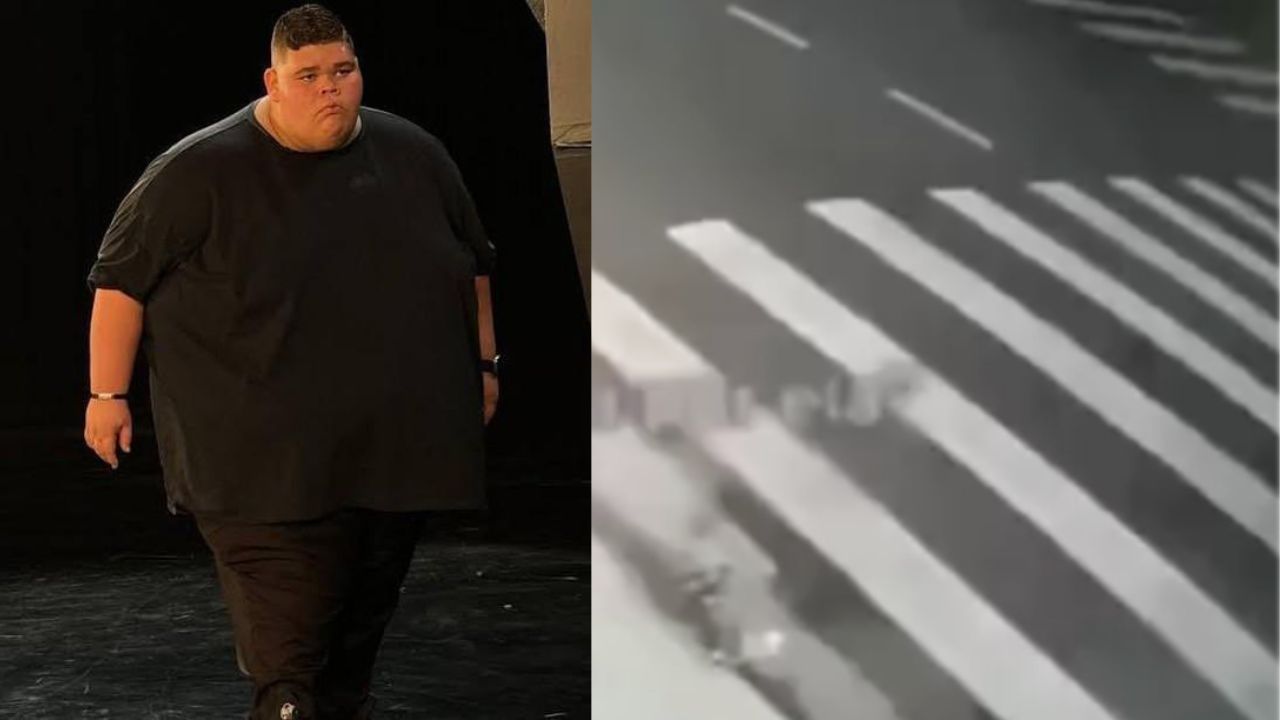 Com mais de 292,5 kg, Gordão aparece na filmagem feita por uma câmera de segurança, perdendo o equilíbrio e caindo no asfalto enquanto pilotava sua moto.