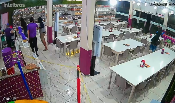 As imagens de segurança mostram três dos assaltantes entrando de forma violenta no local, gritando ordens e apontando armas para todos presentes, enquanto outros dois comparsas aguardavam do lado de fora em duas motocicletas – uma delas sem placa de identificação. Em poucos minutos, os bandidos levaram cerca de R$ 400 em dinheiro do caixa, um notebook avaliado em R$ 5 mil e diversos celulares de pessoas que estavam no local.
