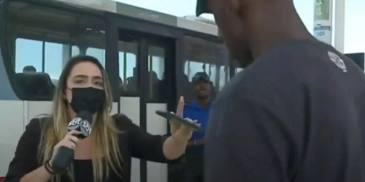 Neste momento, um outro homem entra em cena, e interrompe de vez o trabalho da jornalista. “Nesse momento eu fui desplugada aqui, porque ele pisou no cabo, eu não estou conseguindo te ouvir. Estou sem retorno de áudio”, disse a jornalista, claramente irritada.