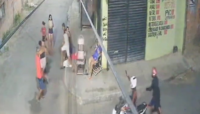 Os bandidos chegam de moto, exibem a arma e saem fazendo um arrastão com as pessoas que conversavam na calçada. Algumas vítimas ainda correm, apesar do risco de levar um tiro.