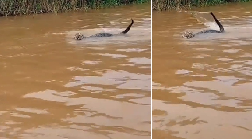 Nas imagens o canoeiro mostra a onça-pintada nadando livre a cerca de a 674 quilômetros de Manaus. “Privilégio”, ele diz, ciente da importância de se manter a riqueza natural e única da nossa região. “Valente”, diz o homem enquanto filma.