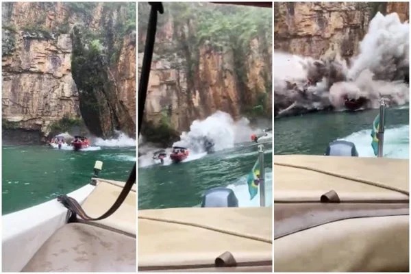 Imagens impressionantes mostram o momento em que pedras se soltam e atingem as embarcações.