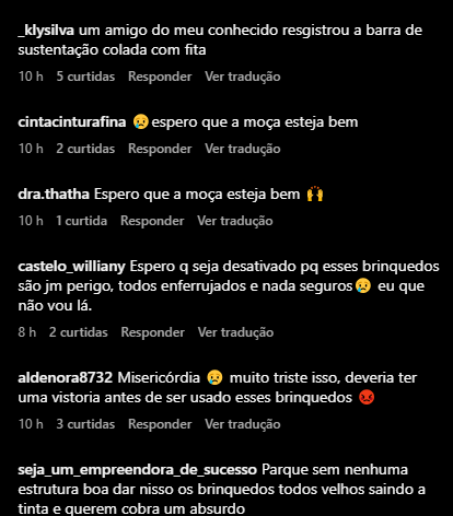 As jovens passam bem, mas o parque será alvo de perícia. O proprietário não teve o nome revelado, mas foi levado para a delegacia. Não se sabe se o estabelecimento tem autorização e laudos para funcionar. “Espero q seja desativado pq esses brinquedos são jm perigo, todos enferrujados e nada seguros😢 eu que não vou lá”, escreve outra.