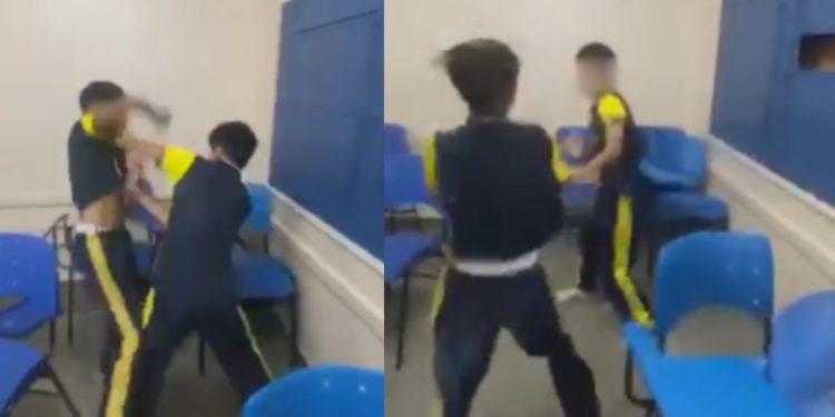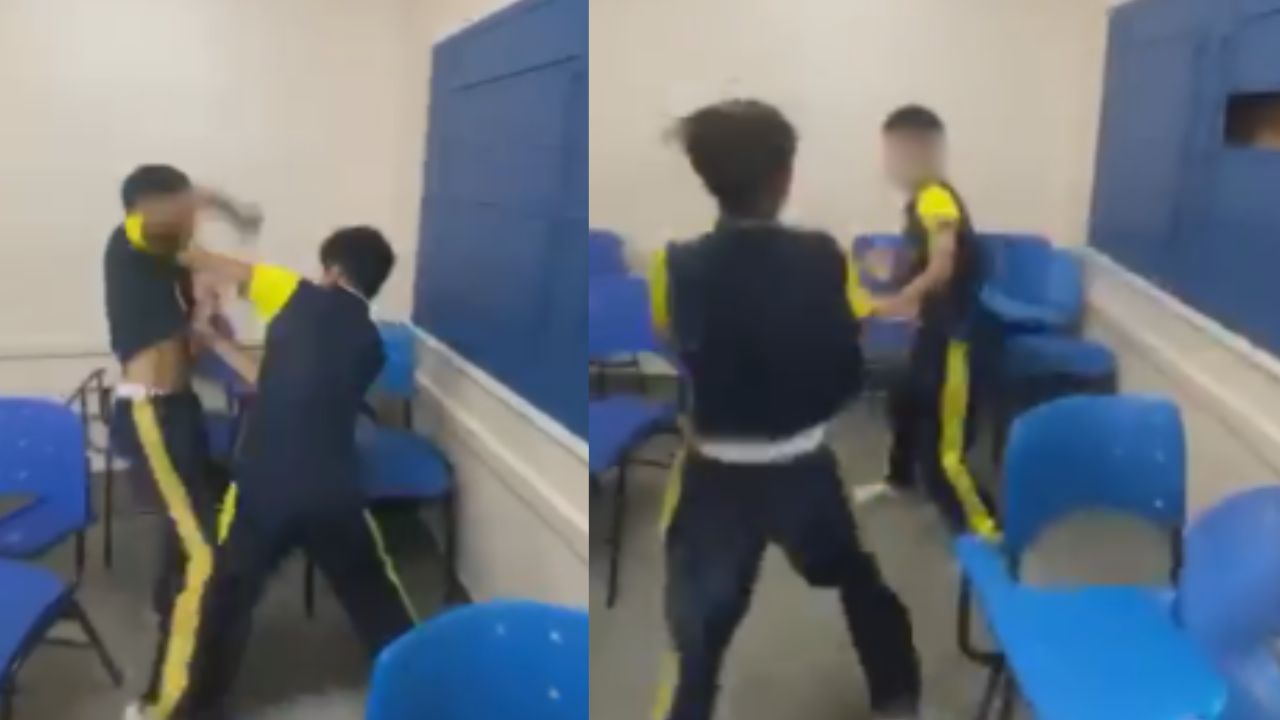No vídeo compartilhado nas redes sociais na quinta-feira (8), dois alunos aparecem trocando socos dentro da sala de aula enquanto outro filma.