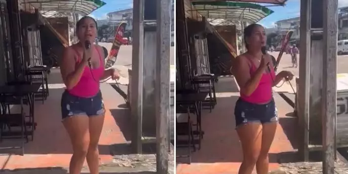 No vídeo, a mulher aparece falando ao microfone e pedindo aos frequentadores que moram ou trabalham nos arredores para que não bebam no estabelecimento se não tiverem dinheiro. Para beber lá, só pagando!