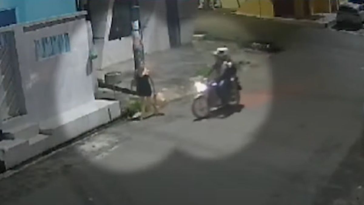 Nas imagens, a mulher aparece na rua caminhando com uma mochila e o celular na mão, quando dois homens chegam de moto. O garupa desce e parte para cima da moça, que prontamente reage.