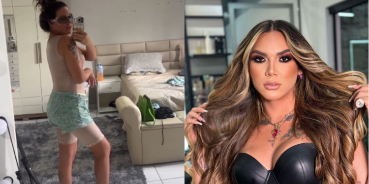 “Parece assim que estou amarrada filhas, no meio, tô aqui com talas na lateral, na frente, atrás, quem olha assim, fala não deu resultado, não estou vendo nada, mas quando tira tudo isso aqui, meu corpo tá assim. A minha vontade, sabe qual era filhas? Abrir aquele negócio ali, pegar um biquíni, e sair doida para uma praia, botar meu c* para jogo. Mas não dá ainda, a realidade por enquanto é essa, mas depois… Olhe bem, analise bem, porque depois, depois”, disparou ela.