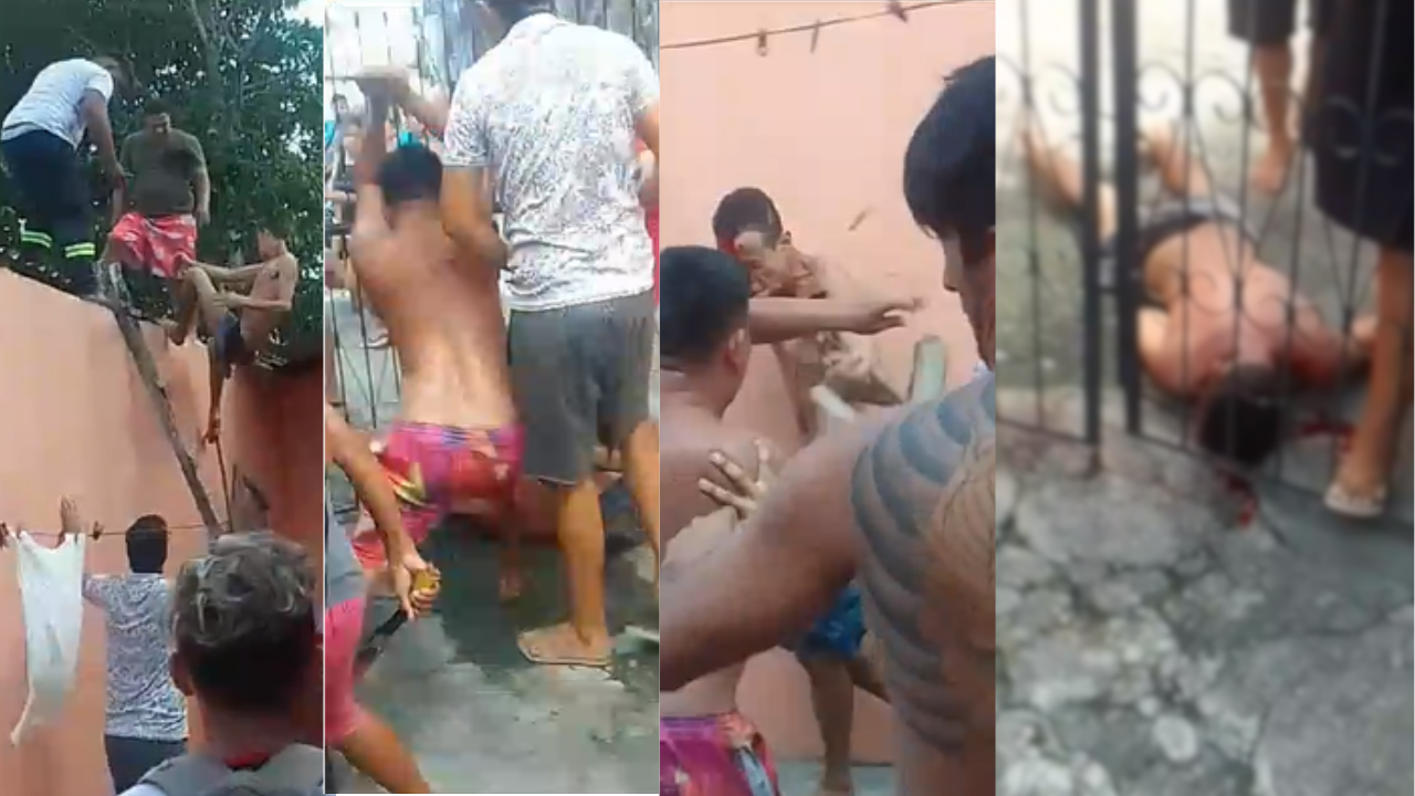 Ele é agredido com toras de madeira e até com um pé de cabra. Desesperada uma mulher tenta impedir, não se sabe se ela seria parente ou apenas ficou nervosa com a sessão de tortura.