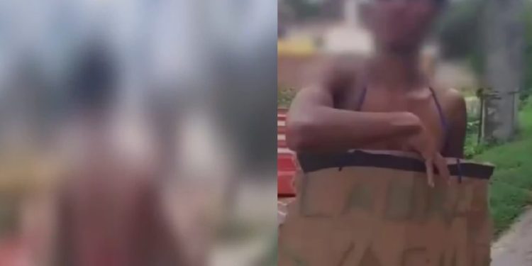 BRASIL – Um homem usando fio-dental foi obrigado a andar na rua com a placa “vacilão”, depois de ser punido pelo tráfico. A placa dizia “sou ladrão vacilão”.