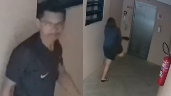De acordo com as imagens, é possível ver a moça caminhando em direção ao elevador. Aparentemente o maníaco já estava a observando e ele corre atrás dela.