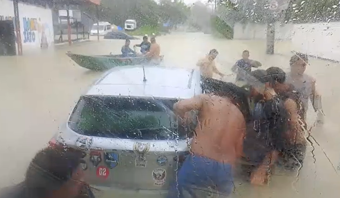 MANAUS (AM) – O temporal que atinge Manaus neste sábado (4) transformou a avenida Torquato Tapajós em um cenário de caos, com alagamentos severos que comprometeram o tráfego de veículos. Em meio à via alagada, um automóvel ficou completamente ilhado, levando um grupo de populares a se mobilizar numa tentativa heroica de resgatar o veículo.