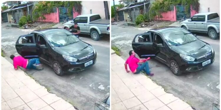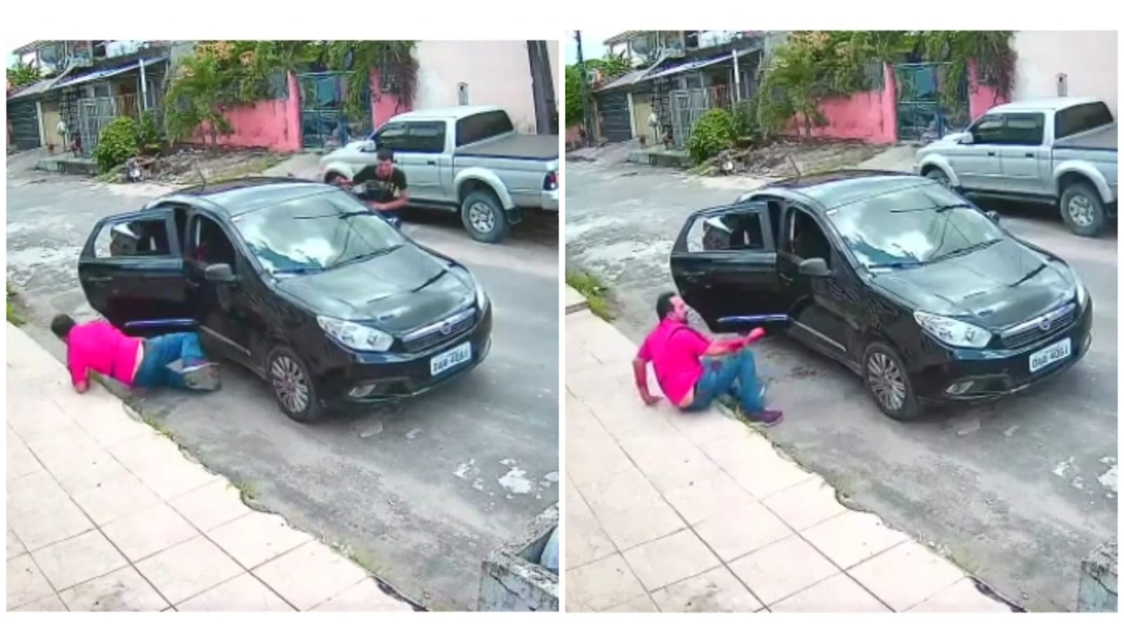 Conformes imagens de uma câmera de segurança ele pula da janela do carro ensanguentado enquanto uma mulher foge do veículo.