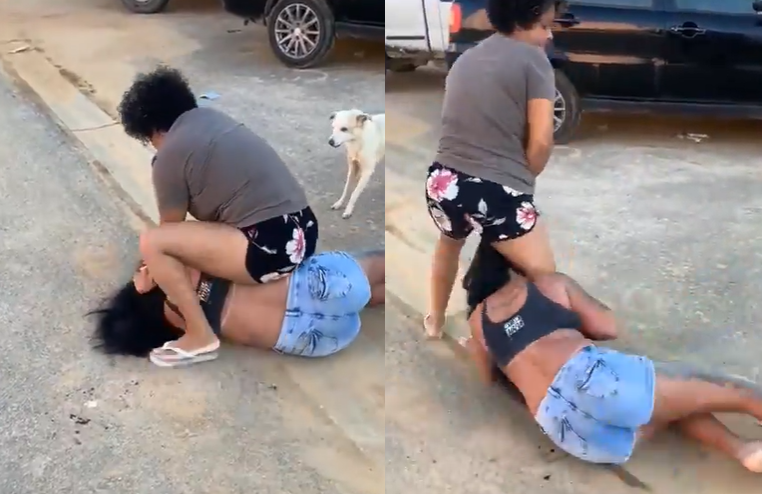 Nas imagens, a traída aparece de short preto e dá vários socos na outra, de short jeans e um cropped preto. A mulher diz que é a segunda vez que pega a mesma mulher com o marido e agride.