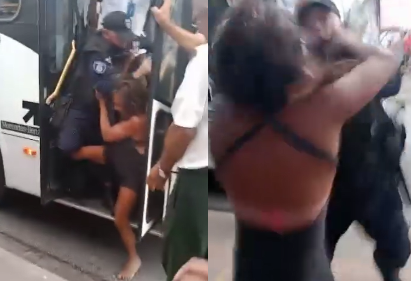 Nas imagens, é possível ver uma mulher trans se pendurando no guarda civil enquanto desce de um ônibus. A porrada começou lá e foi parar no terminal com vários passageiros sem entender nada.