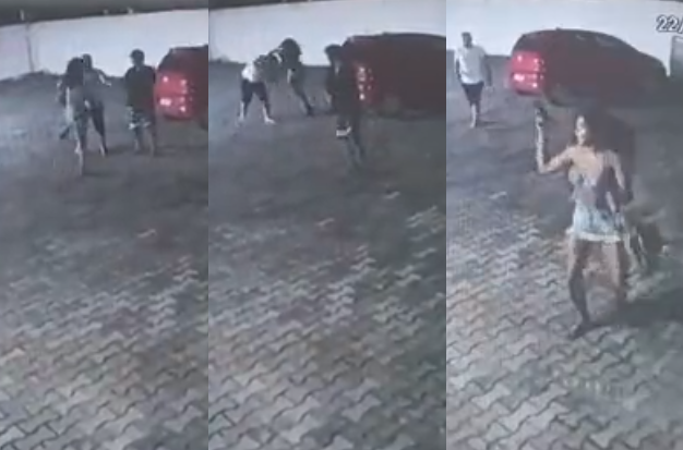 Imagens da câmera de segurança mostram o PM de 48 anos, que estava dirigindo, saindo do carro com o colega, que não participa da briga. Ele aponta a arma para a travesti, mas a mesma dá uma voadora nele e depois mete a porrada. Na briga, um tiro é disparado, mas ninguém é atingido.