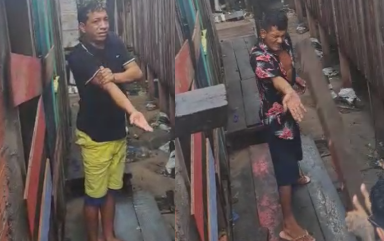 Nos vídeos, cada um deles recebe a sentença de 10 pauladas de perna manca na palma da mão. A cena é registrada em um beco com casas de palafita.
