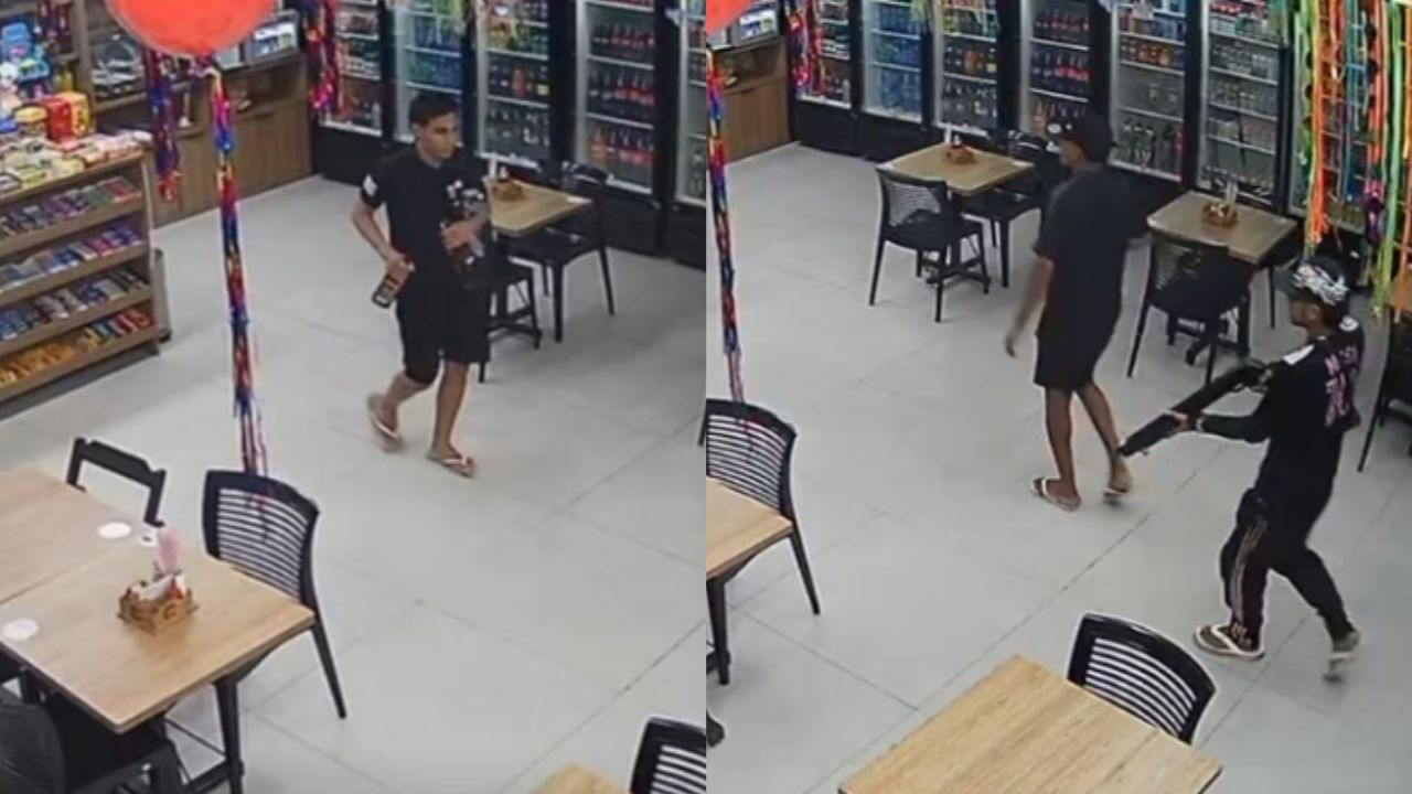 Sem reagir, a vítima observa os criminosos revirando o local em busca de dinheiro e mercadorias, incluindo bebidas e alimentos. Após o crime, o trio fugiu e não foi localizado.