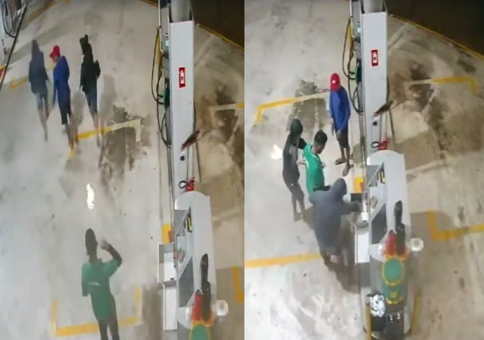 Armados com revólver e facas, eles pegam o celular do frentista e depois enfiam a mão no bolso dele, para retirar o dinheiro. Dois dos bandidos usavam jaquetas com capuz e o terceiro estava de boné.