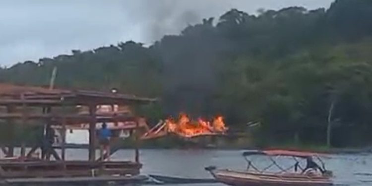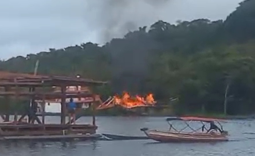 Moradores e canoeiros registraram a cena e o fogo consumindo a balsa. Não há informações sobre feridos até o momento. Os bombeiros estão no local combatendo as chamas.