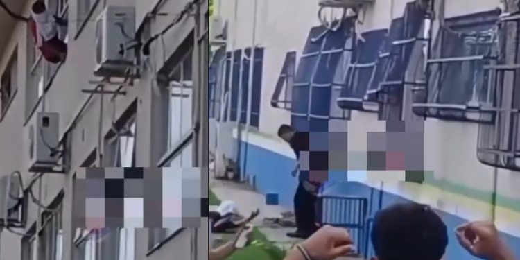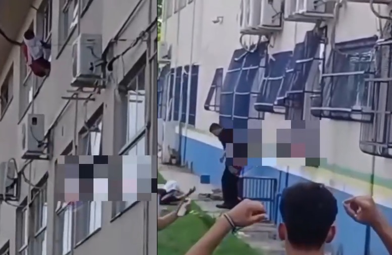 Imagens feitas por professores, alunos e servidores mostraram ele pendurado na janela, antes da queda, que ainda tentou ser evitada por várias pessoas, mas sem sucesso.