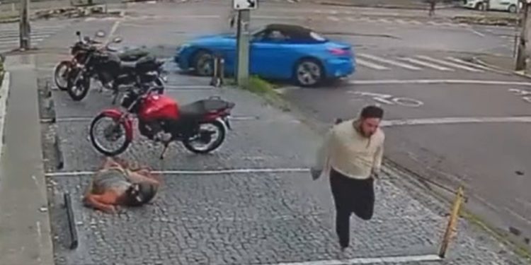 BRASIL – Um motorista de BMW Cabriolet azul matou um bandido que tentou roubar o carro dele no domingo (23). Rápido no gatilho, ele atirou em dois criminosos. Um deles tombou na hora.