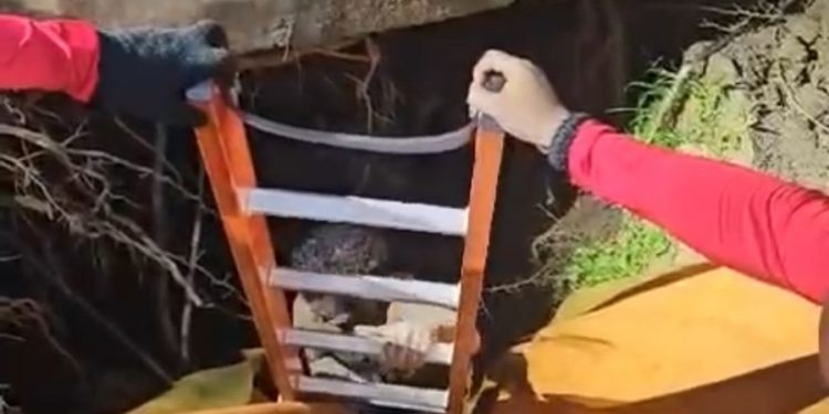 Os bombeiros utilizaram uma escada para tirar o homem. Ele teve algumas escoriações, mas ficou bem.