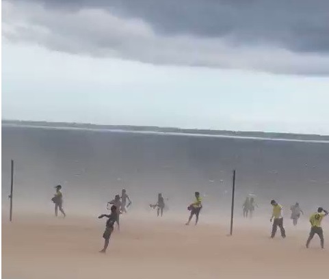MANAUS (AM) – Após comemorarem a vitória do Brasil sobre a Suíça nesta segunda-feira (28), na praia da Ponta Negra, torcedores levaram um susto. Uma rajada de vento varreu o balneário, jogou areia, nas pessoas, levou sombrinhas e assustou que estava no local curtindo o “feriado”.