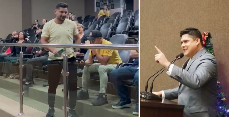 “Eu peço que você se retire, senão será algemado”, diz o vereador. “Quando ele citou portais eu me levantei e pedi a palavra. Foi quando presidente disse ou você fica calado ou sai da Câmara. Foi quando o Iguinho falou que quem manda na Câmara são os vereadores e eu disse que quem manda é o povo. Se vocês como parlamentares não sabem ser cobrados peçam para sair”, rebatou o jornalsta.