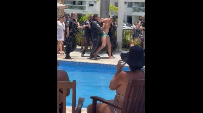 Em vídeos que circulam nas redes sociais, um policial militar precisou entrar dentro da piscina do condomínio e segurar Renato para tentar contê-lo.